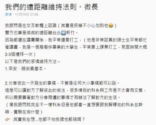 她於Dcard討論區發文,分享與男友遠距離戀愛的維持心得。樓主表示,自己與男友經交友程式認識,屬於「微微的遠距離」,她身處台北讀大學,而男友則於新竹修讀碩士課程,由於兩人仍在讀書,每隔2至3星期才可見面一次。