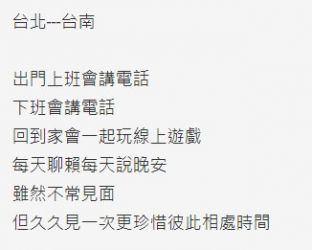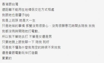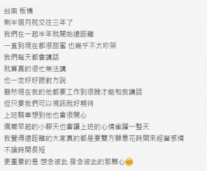 對情侶們來說,能夠常常見面、甜蜜地「拍拖」當然理想,但即使在網絡發達的今日,遠距離仍然是不少情侶難以跨越的難關。有台灣女生近日於討論區發文,分享與男友遠距離戀愛的維持方式,吸引多個同樣在經歷遠距離戀愛的網民留言交流。有網民分享自己及朋友的「異地戀」經驗,直言距離並非影響感情的主要原因,兩人的心態才是最重要。
