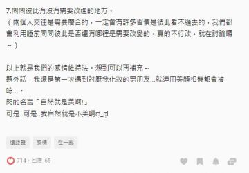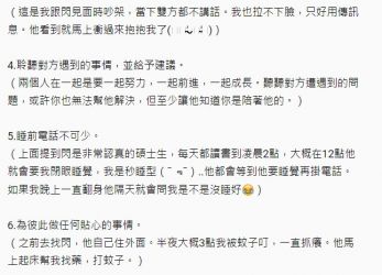 與一般情侶一樣,遠距離戀愛的情侶交往時同樣需要磨合。樓主表示,為了維持感情,她跟男友每晚都會利用睡前時間,「問問彼此是否還有哪裡需要改變的,真的不行改,就再討論囉」。樓主的半分享半建議引起不少遠距離戀愛網民的共鳴,紛紛留言表示認同,稱「遠距離真的要靠雙方努力維持」、「你講的每一項真的不可或缺」、「遠距離的大家真的都是要雙方願意花時間來經營感情」。