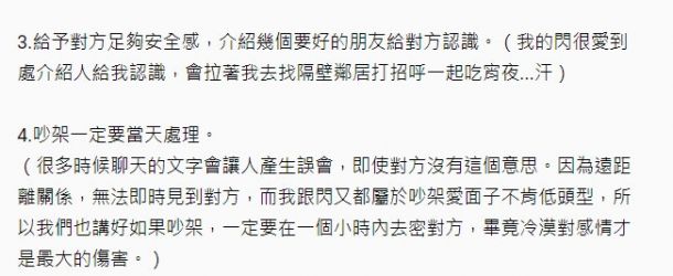 樓主提到,要維持戀愛的關係,「早安、晚安最基本」、「睡前電話不可少」,除了每天保持對話外,亦要主動「分享彼此一天發生的事情,不管是任何大小事情都可以說」。她解釋,因情侶相隔兩地,雙方的工作或生活未必會交集,「所以需要靠著對方分享周遭的事情才有辦法了解對方的生活」,認為從中可更了解彼此的想法。