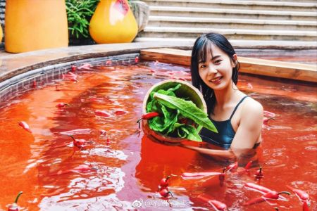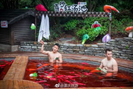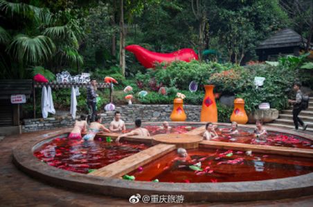 重慶融匯溫泉城推出了一種全新的溫泉「奇妙紅湯池」,原本圓形的湯池被分開成四格,有如平時吃火鍋時會挑選四種不同湯底而分開四格擺放。但該四格「紅湯池」均為同一種湯底,湯底雖然呈紅色,表面上更浮有辣椒、蔬菜等道具,十足十平時的麻辣火鍋,但其實它是以雞血藤、愛葉、紅花、首烏等中藥材料加上紅酒製成,並非真的是麻辣湯底。