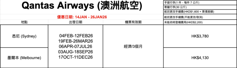 悉尼,布里斯班, 墨爾本阿,得雷德, 奧克蘭, 基督城 等熱門澳紐地點!! 包30KG 寄艙行李!! 澳航唔收燃油費用