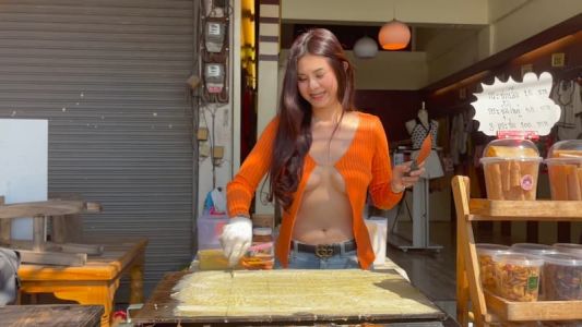 最近泰國就有位在街頭賣蛋捲的妹子,憑著超大膽的「真空罩衫」,讓顧客一邊等蛋捲的同時還能光明正大欣賞她的胸前風光,營業額瞬間暴漲 4 倍!而附近的商家發現她的「財富密碼」之後也紛紛跟進效仿,在當地掀起一股風潮,穿著一個比一個還清涼,最後甚至還引發警方關切警告!
