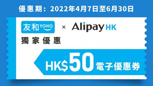 登記支付寶AlipayHK收取消費券的用戶,可於Alipay HK手機應用程式內領取友和$50電子優惠券。憑優惠碼於友和購物,買滿港幣$1,000即減$50。