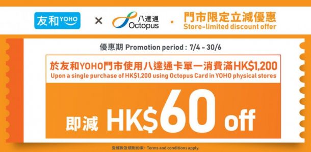 由4月7日起至6月30日,憑八達通於友和門市單一消費港幣滿$800,可享$40立減優惠;消費港幣滿$1,200,更可享$60立減優惠!