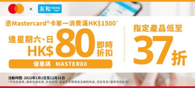 由即日起至2022年12月31日,逢星期六、日於友和YOHO網店使用Mastercard卡單一簽賬滿港幣1,500元,輸入優惠碼【MASTER80】即減港幣$80,購買指定產品更可享低至37折優惠!使用Tap & Go的Mastercard付款亦可以享有優惠!