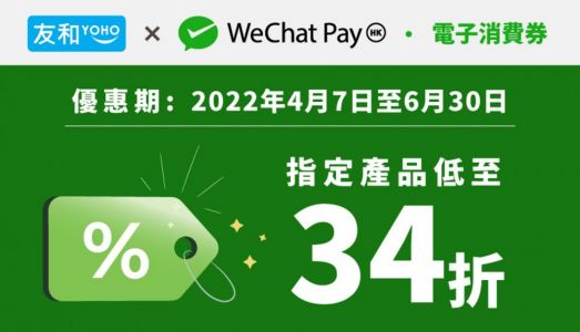 由4月7日起至6月30日,憑WeChat Pay HK於友和購買指定產品低至34折,數量有限,售完即止!