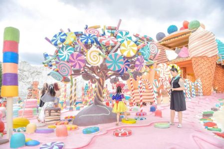 五顏六色的糖果樹、冰淇淋、薑餅屋、杯子蛋糕、甜甜圈、棒棒糖等,四周粉嫩的色彩非常夢幻,宛如置身在夢境中一樣,直叫人少女心爆發!