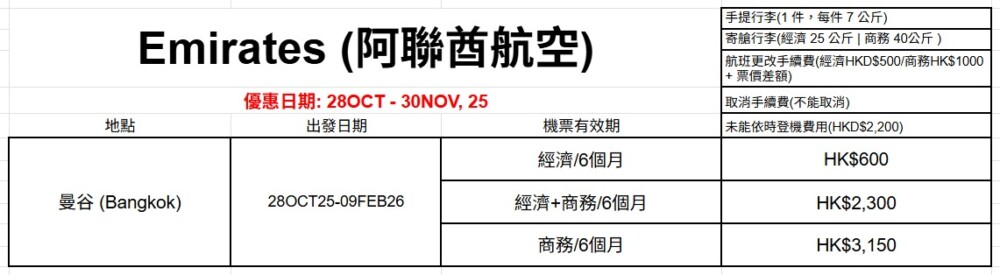 1 EK 385 HKGBKK 大約3小時15分鐘 2130 2345