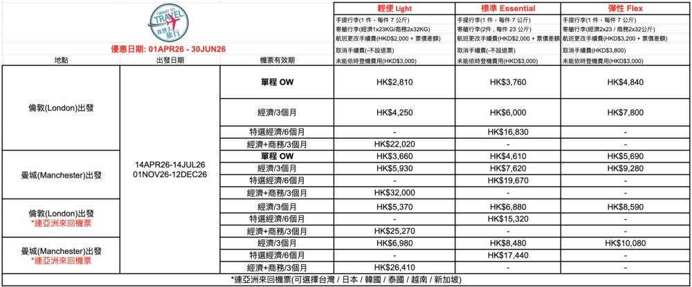 *以上價格會因季節性而調整,價錢未連稅金以及燃油費用,最終報價請向我們查詢,請把英文姓名,出發/回程日期Whatsapp給我們!