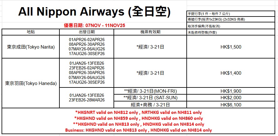 而主打嘅日本線,ANA亦有飛2個機場(成田NRT / 羽田HND).而且呢個價包1件23kg寄艙行李,日本迷點可以錯過!