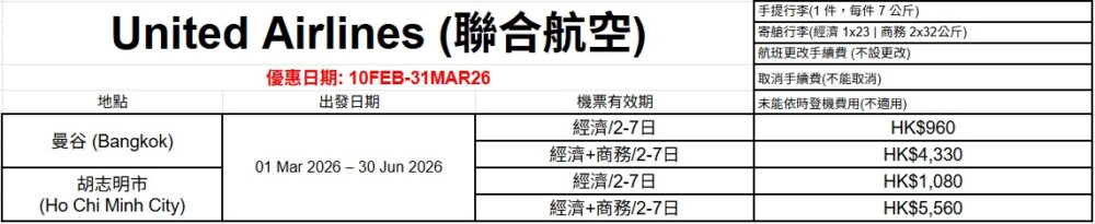 聯合航空直航香港往返美國/泰國曼谷/越南胡志明市