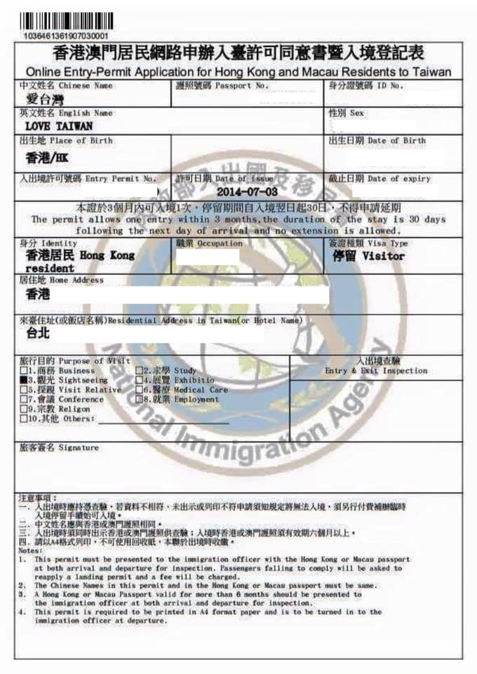 香港居民入臺證(包含「境外人士線上申辦系統」(線上系統)及「臨時停留許可」(網簽))