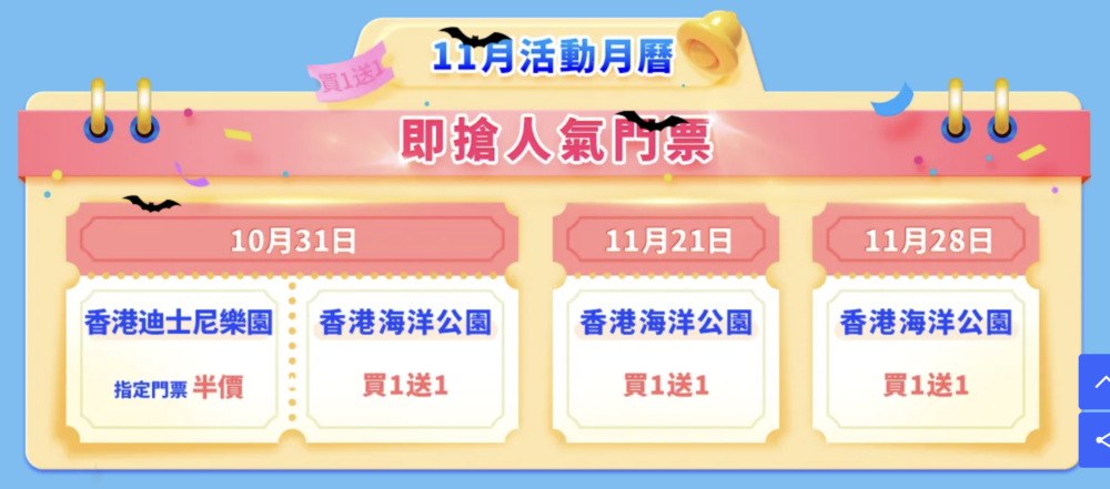 - 11.21 10am、11.28 10am 香港海洋公園門票買一送一