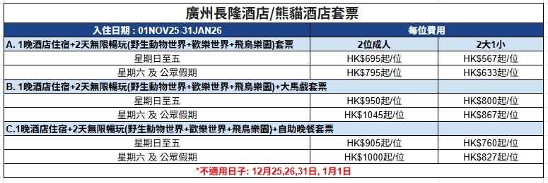 - C)【港澳台及海外遊客專享 . 無限暢玩3園+大馬戲+晚餐】高級房2晚 (含“一票多園”3日門票 +廣州長隆馬戲票+自助晚餐1次)雙人套票 HK$5,880起