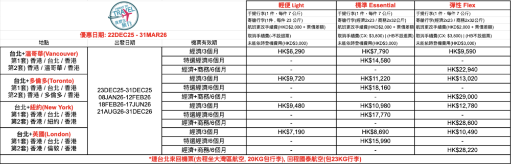 必需第一程坐:大灣區航空飛台北(包20KG行李) + 其餘航班:坐國泰直航(包23KG行李)!不能更改次序!