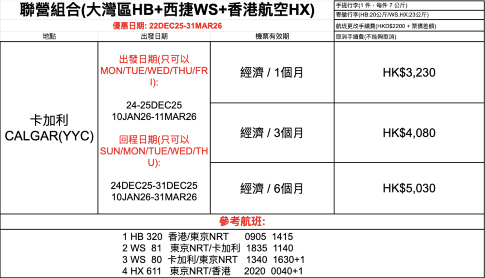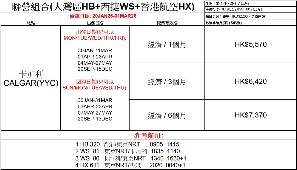 3 WS 80 卡加利YYC/東京NRT 1340 1630+1 (包23KG行李!)