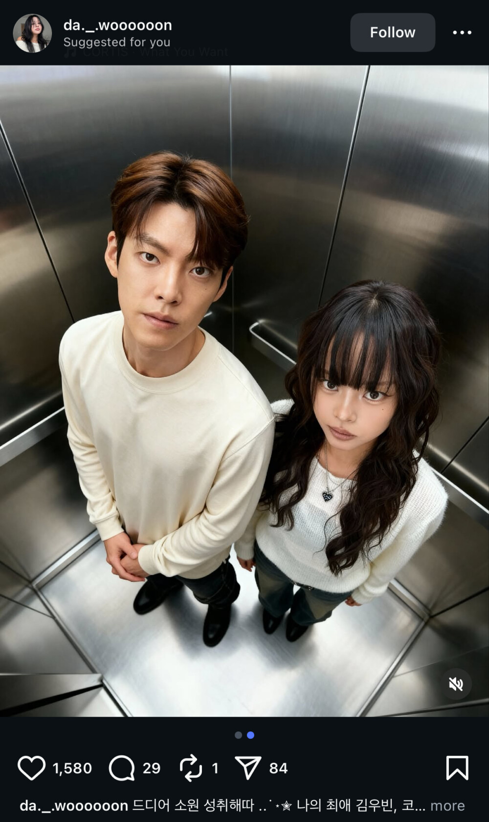 請將圖1和圖2融合成一張電梯中的雙人俯拍自拍照,畫面構圖緊湊,兩位主體靠得很近,頭部略微上仰,眼神直視鏡頭,營造出強烈的視覺衝擊力。左側人物站得略靠前,參考我圖1的主體形象特徵造型保持不變,需要保持人臉相似度;右側人物參考圖2的主體形象特徵保持造型不變,需要保持人臉相似度,略微內扣身體,拍攝角度高角度俯拍,使頭部比例被誇張放大。背景銀色本身,簡潔乾淨,進一步凸顯人物主體。畫面風格偏向日系視覺系,整體畫面清晰度高,用iphone前置自拍,最終呈現出精緻、時尚、略帶的合影效果。要求人物實現無縫融進畫面, 視覺過渡自然,整體畫面光線明亮且均勻。