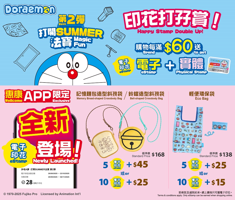 由 9 月 26 日至 10 月 23 日期間,已下載惠康 APP 並已綁定 yuu ID 的會員於惠康實體門市或網店消費每滿$60,即可獲電子印花乙個; 滿$120 可獲兩個,如此類推,門市購物更可同步獲得實體笑印及電子印花,讓你線上線下均可輕鬆收集笑印!集齊指定數量電子印花,即可於 11 月 6 日或之前,透過惠康 APP 獨家換購「多啦 A 夢 打開 SUMMER 法寶」第 2 彈精品。各位多啦迷立即行動,親臨惠康門市或瀏覽網店,一擁心愛的多啦 A 夢小物回家吧!