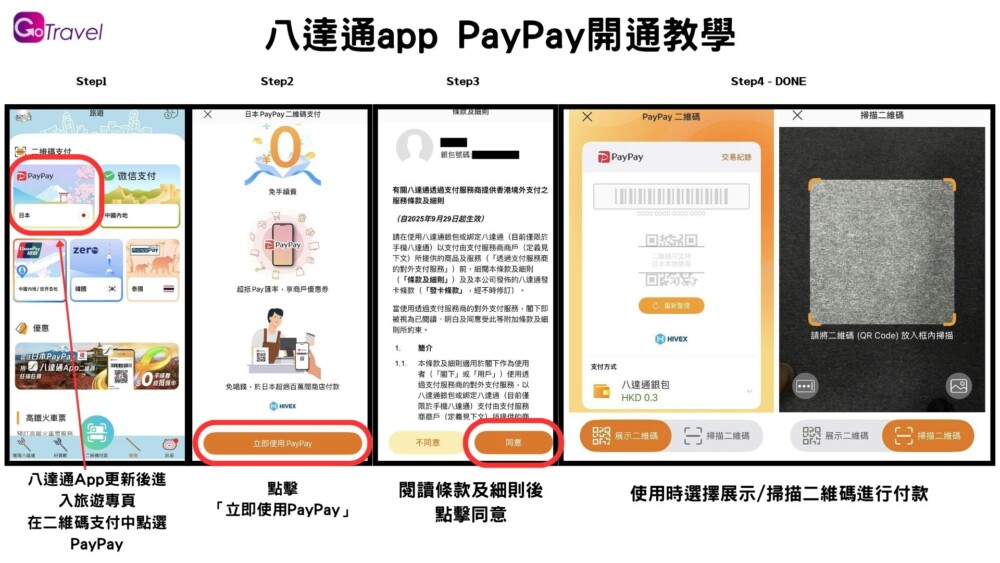 八達通正式與日本電子支付平台PayPay展開合作,從即日起,用戶只需將八達通銀包升級至Plus或Pro級別,並更新八達通App,即可在旅遊頁面開通日本支付服務。通過銀行App、轉數快或現金充值,將資金轉入八達通銀包後,用戶便可輕鬆掃描二維碼,以港幣完成支付。