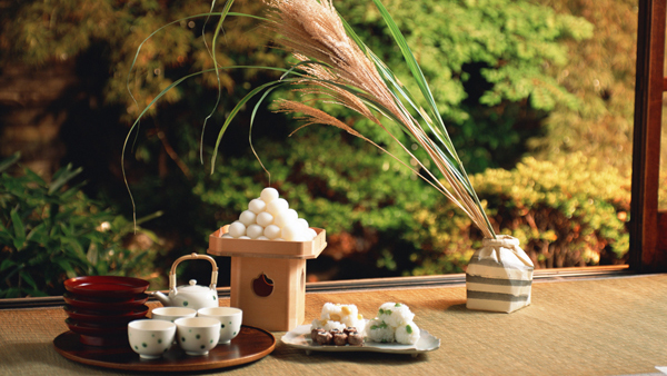 日本 | 十五夜/月見 | 感謝豐收、靜賞明月 | 陳列月見團子、芋頭、栗子等時令食物。 | 月見團子 |