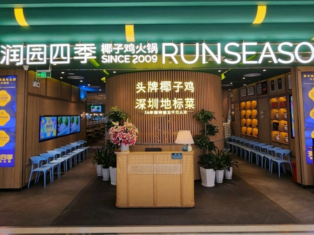 追求養生之道的食客,總會循著椰香找到潤園四季。精選的海南老椰青水作湯底,加入五指毛桃增添若隱若現的草本香氣。散養180天的文昌雞皮脆肉滑,服務員會在沙漏流盡時精準起鍋,此刻的雞肉裹著椰香,蘸上沙薑青桔調料,正是嶺南食補哲學的完美呈現。萬象天地店綠植環繞,宛如都市綠洲。