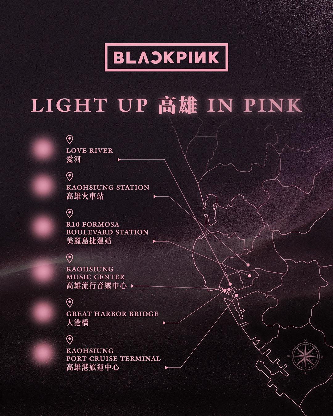 這場由 Live Nation Taiwan 策劃的視覺盛宴,自昨晚起正式展開,每晚五時半至十時半,愛河沿岸、大港橋、高雄港旅運中心、高雄流行音樂中心、高雄車站,以及享譽國際的美麗島捷運站「光之穹頂」,將一同綻放浪漫粉紅光芒,將整座城市籠罩在夢幻氛圍之中,也為BLACKPINK四位成員的到來獻上最具誠意的歡迎。