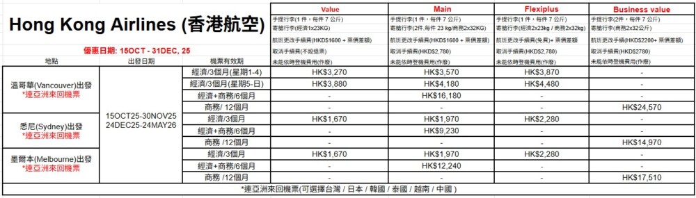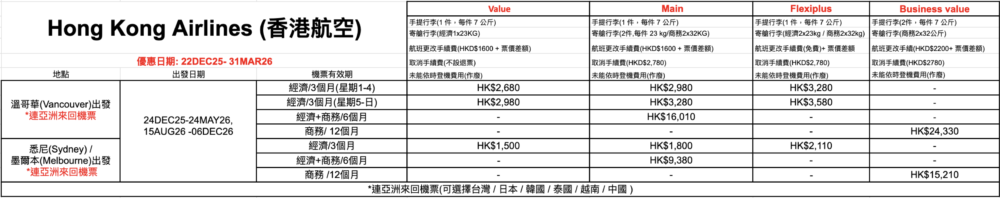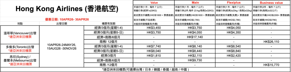 【機票優惠】 外地出發往香港:Hong Kong Airlines 香港航空機票優惠