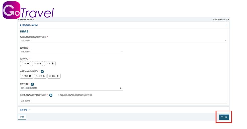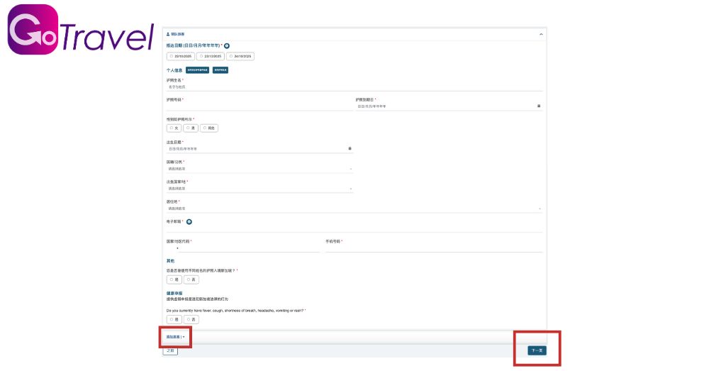 3|如果有同行人員,可以按左下角「添加旅客」一同申請,並在完成後選下一頁。