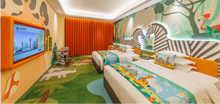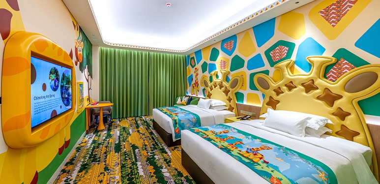 長隆長頸鹿城堡酒店,是清遠長隆度假區推出的第一家親子主題酒店,其主題取材于長隆原創動畫片《卡卡虎大冒險》中長頸鹿“酋長一家”的故事。長頸鹿IP作為一種文化符號,也將突破“次元壁”,把虛擬動畫角色和現實動物的觀賞互動相結合,創新消費場景、捕捉情緒價值,為遊客打造多元化沉浸式體驗。