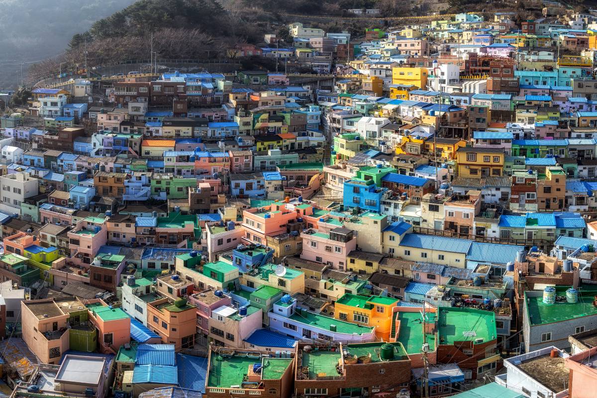 甘川洞文化村原本是1950年代韓國戰爭難民的聚居地,經過藝術家與居民的共同努力,如今已轉型為充滿童話色彩的文化藝術村。這裡被譽為「韓國的聖托里尼」,沿著山坡層層堆疊的彩色房屋,形成了獨特而迷人的景觀。