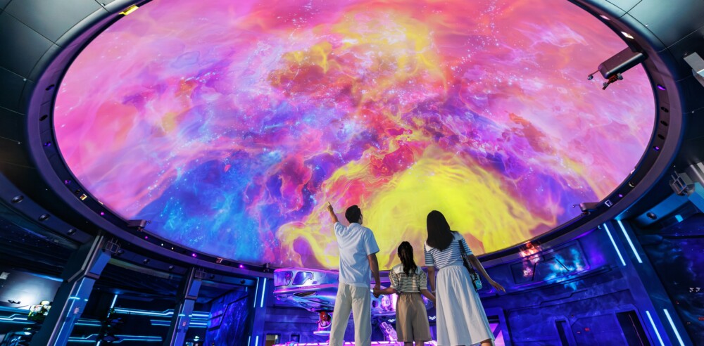 “鯨豚宇宙”區域主要展示的是現代的鯨豚,講述了鯨豚由陸地重返海洋的獨特演化故事,以及海中哺乳類延伸出廣大的鯨豚家族。使用骨傳導、裸眼3D等技術的多媒體機台,呈現了鯨豚之歌、回聲定位、藍碳、遷徙等知識,揭示了令人嘖嘖稱奇的大洋鯨豚奧秘。賓客透過船體舷窗觀看大洋,近距離看到虎鯨快樂生活的樣貌,傳達海洋生物與人類密不可分的觀念。以多媒體展示的互動形式,把海洋深處“一鯨落,萬物生”這深海最美的朝聖景象呈現給賓客,用超大型180°環形投影,及全息多媒體技術,唯美的展示鯨落的過程,讓人們瞭解鯨魚對於海洋生態乃至全球氣候的重要性,呼籲人們參與到保護環境、保護鯨魚的行動中來。