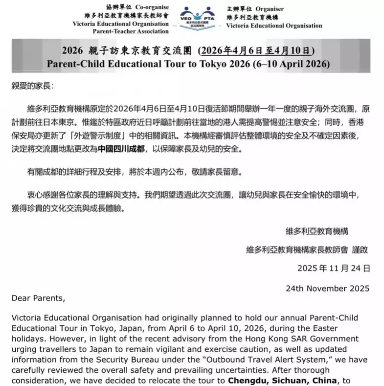 維多利亞教育機構近日宣布,原定於2026年復活節假期舉辦的「親子訪東京教育交流團」,經審慎評估後將目的地調整為中國四川成都。此決定是基於特區政府近期發布的旅遊安全提示,以及香港保安局更新的外遊警示資訊,旨在確保參與幼兒與家長的安全。
