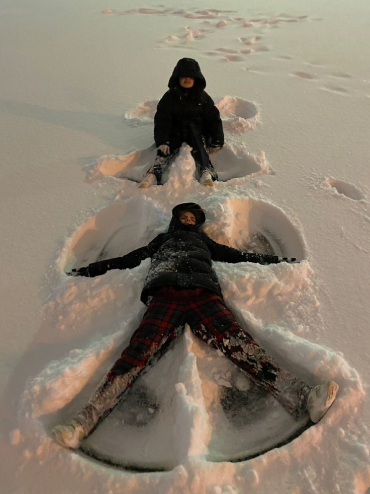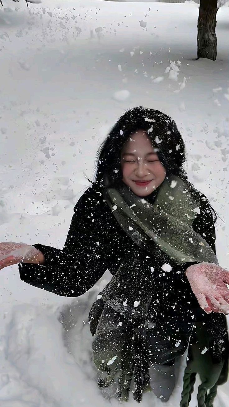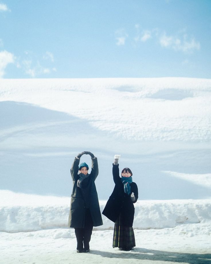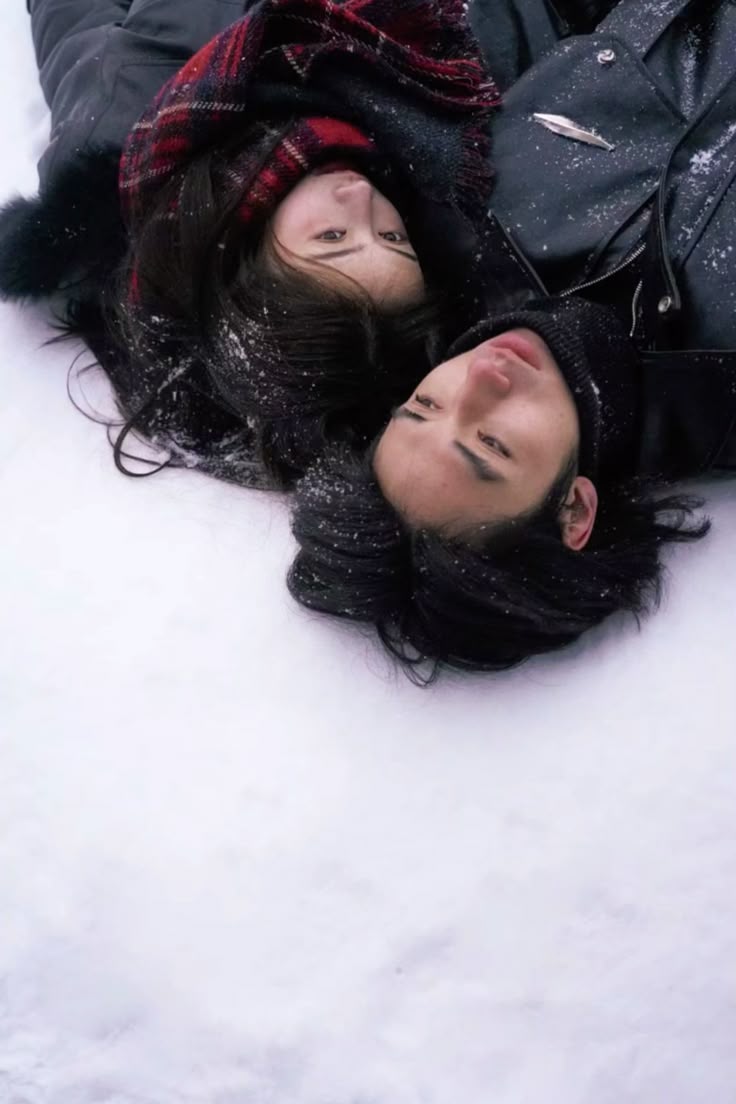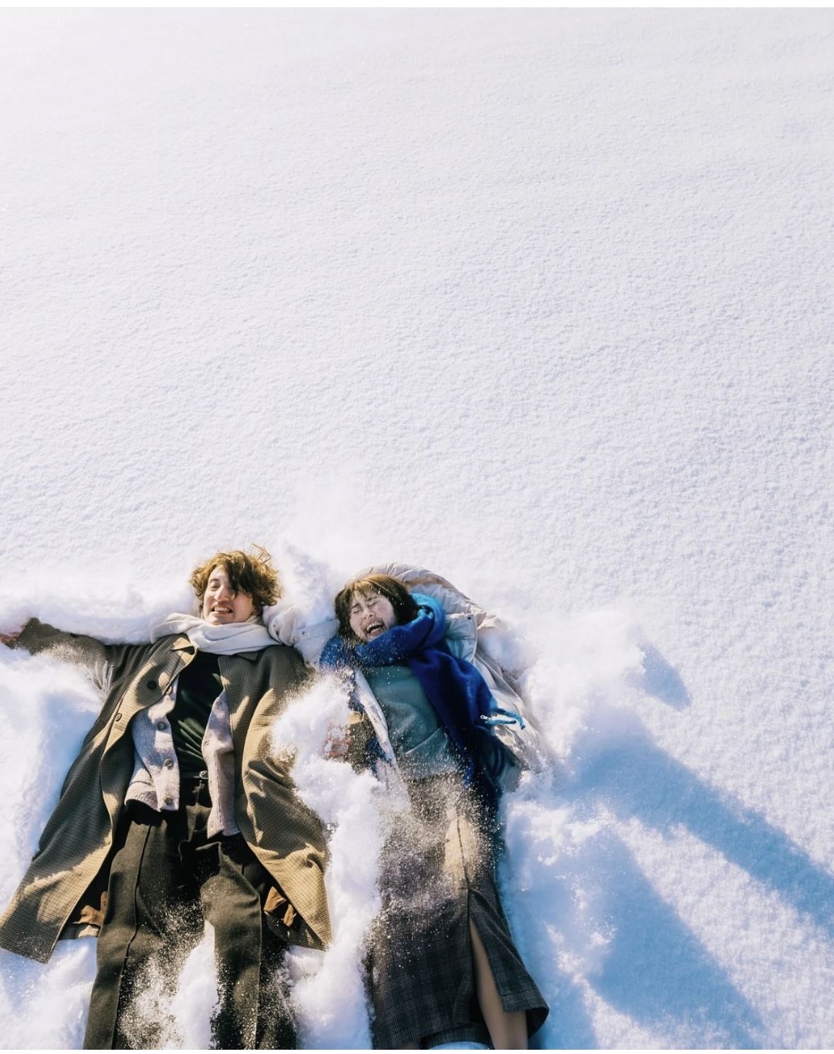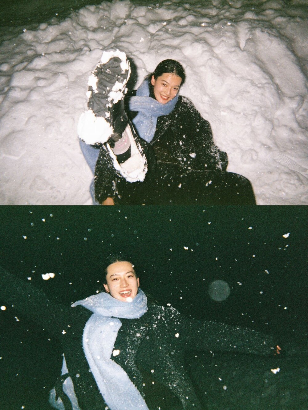 雪地軟綿綿的時候怎麼可以不躺一下?無論是笑得開懷還是就這樣躺著,任由雪附著在衣服與髮絲,完美呈現冬日感。