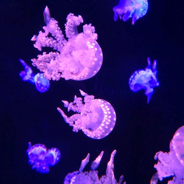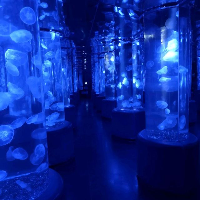 商場二樓藏著一座迷人的 「海洋奇夢館」。雖然規模並非最大,但精緻的展缸與夢幻的水母廳非常適合小朋友,能近距離觀察海洋生物。入夜後,園區的光影藝術裝置會隨聲音與人流變化,景色格外浪漫。