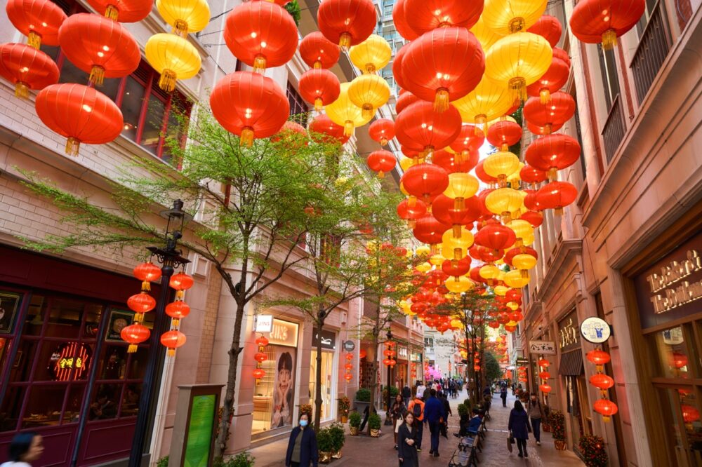 超過800盞金紅色的華燈,懸掛於約200米長的林蔭大道上空,形成一條璀璨的「鴻運燈廊」。在中庭區域,還有由12棵近3.5米高的粉紅色桃花樹組成一個浪漫的開運庭院。期間設有醒獅表演、揮春派送及新春市集等系列活動,動靜皆宜。佈置將持續至元宵節(3月3日) 及西方情人節(2月14日),是情侶共度佳節的浪漫背景。