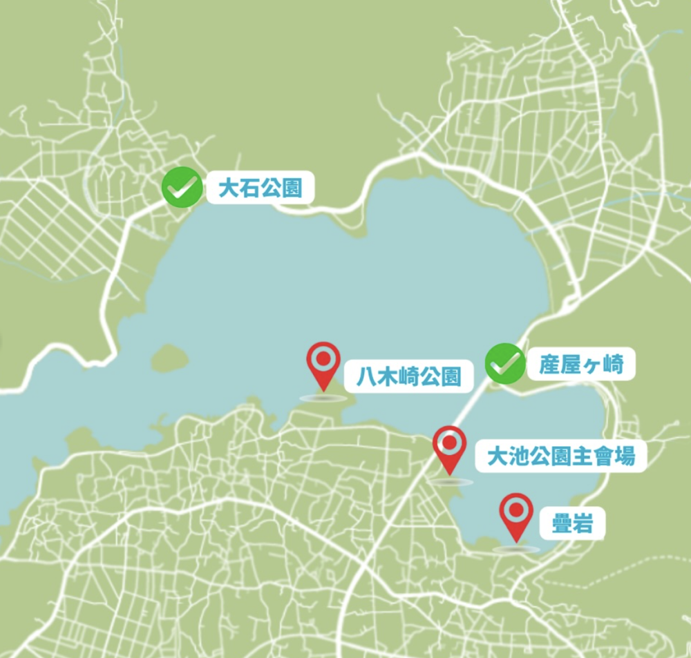 • 官方施放會場:大池公園、疊岩、八木崎公園(煙火從這些地點附近的湖面升起)