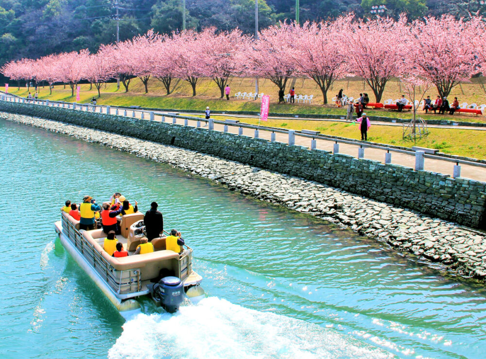 蜂須賀櫻係早開花嘅品種,一般由2月中開始綻放,花期長達大約一個月。淡淡粉紅色嘅花海沿住助任川兩岸盛開,倒映喺水面上,形成一條粉紅色的水道隧道。最夢幻嘅欣賞方式,就係坐上瓢簞島遊船,沿住助任川緩緩前行。春天嘅微風吹過,花瓣隨風飄落,有時會輕輕落到船上、落到水面。從河中央仰望兩岸嘅櫻花並木,嗰種被粉紅色包圍嘅感覺,真係靚到爆!