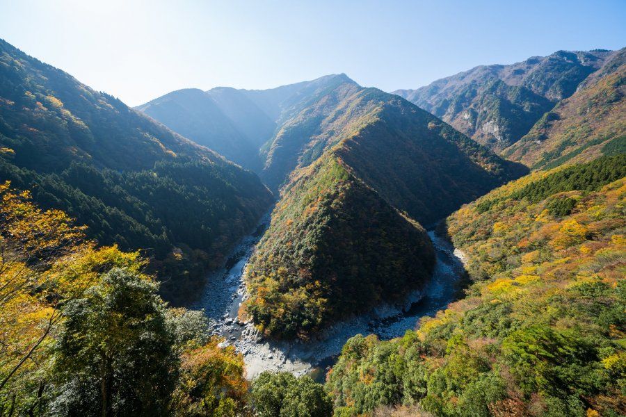 日本三大秘境之一,祖谷溪位於祖谷川沿岸,兩旁聳立高山與斷崖峭壁交錯,河流經年累月將山脈切割出深深的V字型峽谷,谷底流淌著翡翠綠的祖谷川,景色震撼懾人。