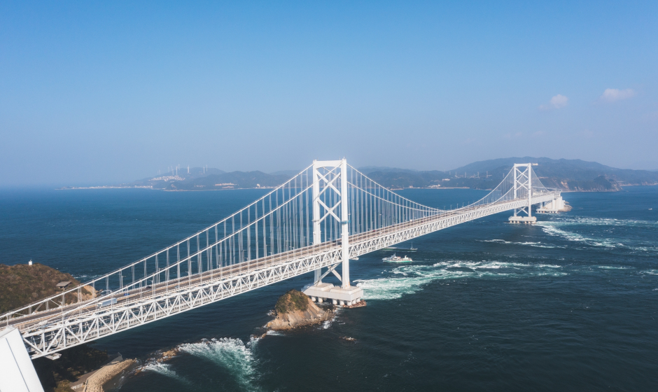 走進大鳴門橋的橋桁內部,有一條名為「渦之道」的瞭望散步路。從海上45公尺的高處,透過腳下的強化玻璃窗,你可以直接俯瞰漩渦在海面上翻滾、旋轉、消散、重現。那種站在半空中、腳下就是奔騰海流的感覺,既安全又帶著恰到好處的驚險。