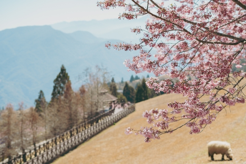 清境農場位於海拔1600至2100公尺之間,四季風情各異,此時櫻花盛開,美不勝收。這裡遠離城市喧囂,宛如世外桃源,被譽為「霧上桃源」。
