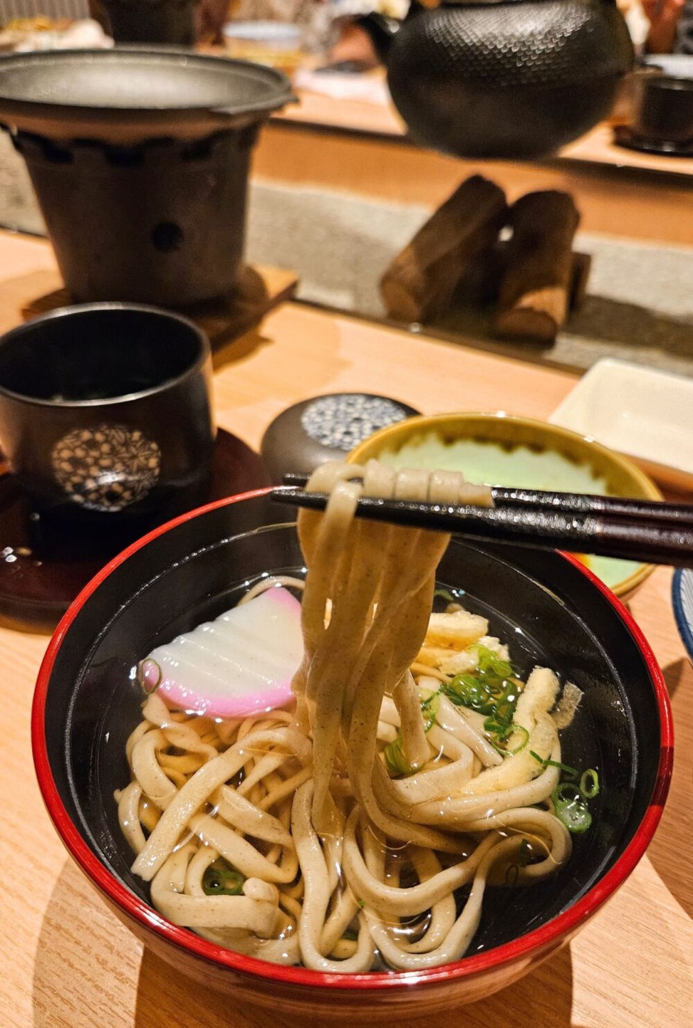 桌上先端來的是一盤晶亮的半田素麵,麵條細長、口感滑溜,嚼起來有點像米線但更柔順。師傅把素麵浸在濃郁的高湯裡,湯頭深厚帶著鮮味,單吃一口就是暖心的滿足;若把麵夾起入口,麵條充滿湯汁,香氣在口中層層綻放,令人回味。配上一碗剛出鍋的釜飯,米香與湯汁互相呼應,飽足感與幸福感同時到位。