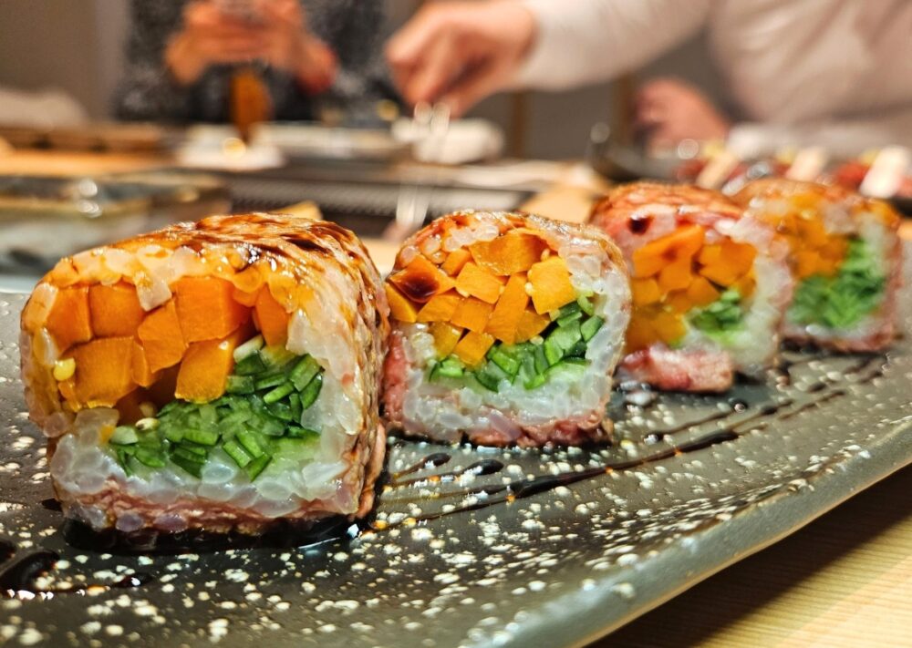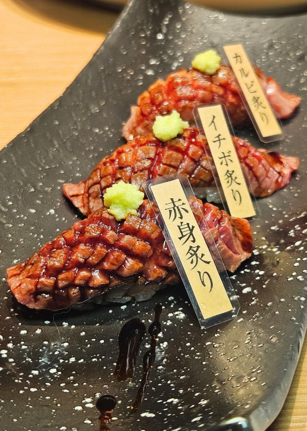那片薄薄鋪在醋飯上的生牛肉,確實需要一點心理準備。它不像燒肉那樣有著熟悉的炭火香氣與焦脆邊緣,也不像牛排那樣經過梅納反應的洗禮,而是以最原始的姿態呈現 —— 漂亮的肌理、柔軟的質地,以及那一抹介於生與熟之間的曖昧色澤。