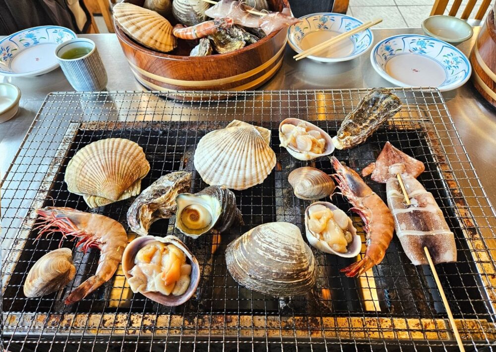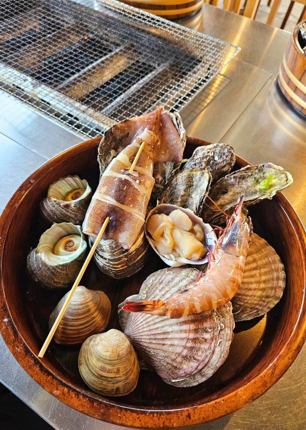 這裡的海鮮燒烤是招牌,菜單上琳瑯滿目的選擇讓人眼花撩亂。你可以看到各種定食,像是炸牡蠣定食、炸竹莢魚定食,大約800到900日幣,都附有白飯、味噌湯、醬菜和每日小菜。當然,如果想吃得更豐富,也有包含多種海鮮的燒烤組合,可以根據預算請店家搭配。更吸引人的是,這裡還提供100分鐘的牡蠣吃到飽,大人3000日幣,可以盡情享受烤牡蠣的鮮美。