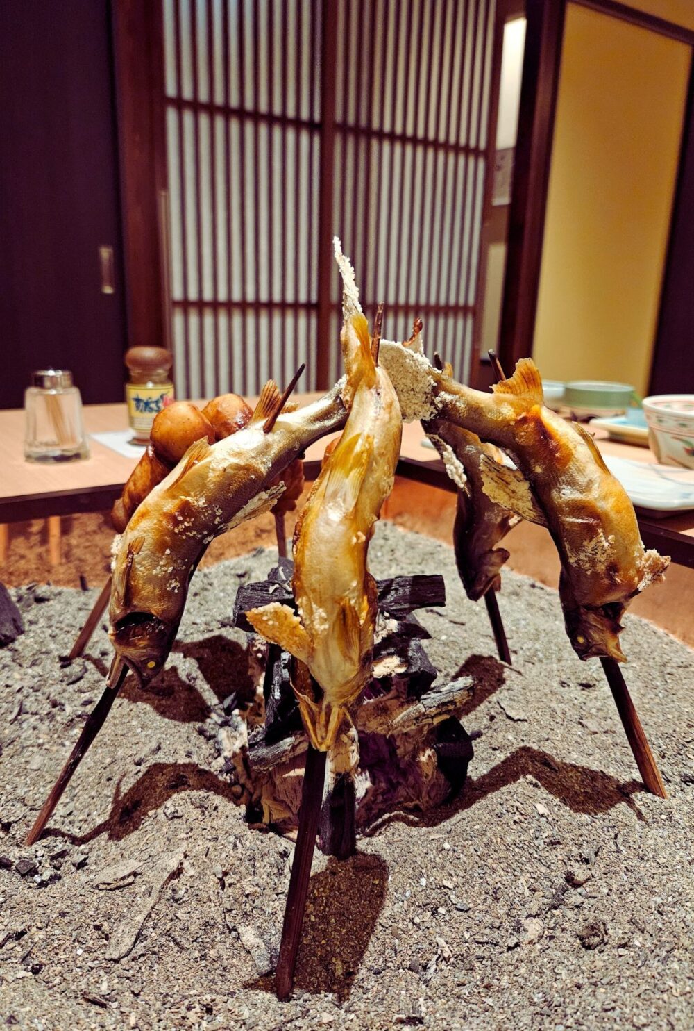 中央烤爐帶來的新鮮感,讓用餐不再只是品嚐食物,更是一場觀賞的饗宴。看著油脂滴落、聽著炭火燒烤的滋滋聲響,這種期待感遠比直接端上桌的料理來得強烈。尤其你提到的烤岩魚,又肥又大的溪流魚在炭火旁散發香氣,正是最具日本鄉土風情的一幕。而被烤魚遮住的「でこまわし」,若翻成「旋轉木偶串烤」真是傳神,里芋、豆腐、蒟蒻圓潤串在一起,確實在爐火前像極了可愛的人偶,這是德島特有的鄉土料理,能在這裡品嚐到格外有意義。
