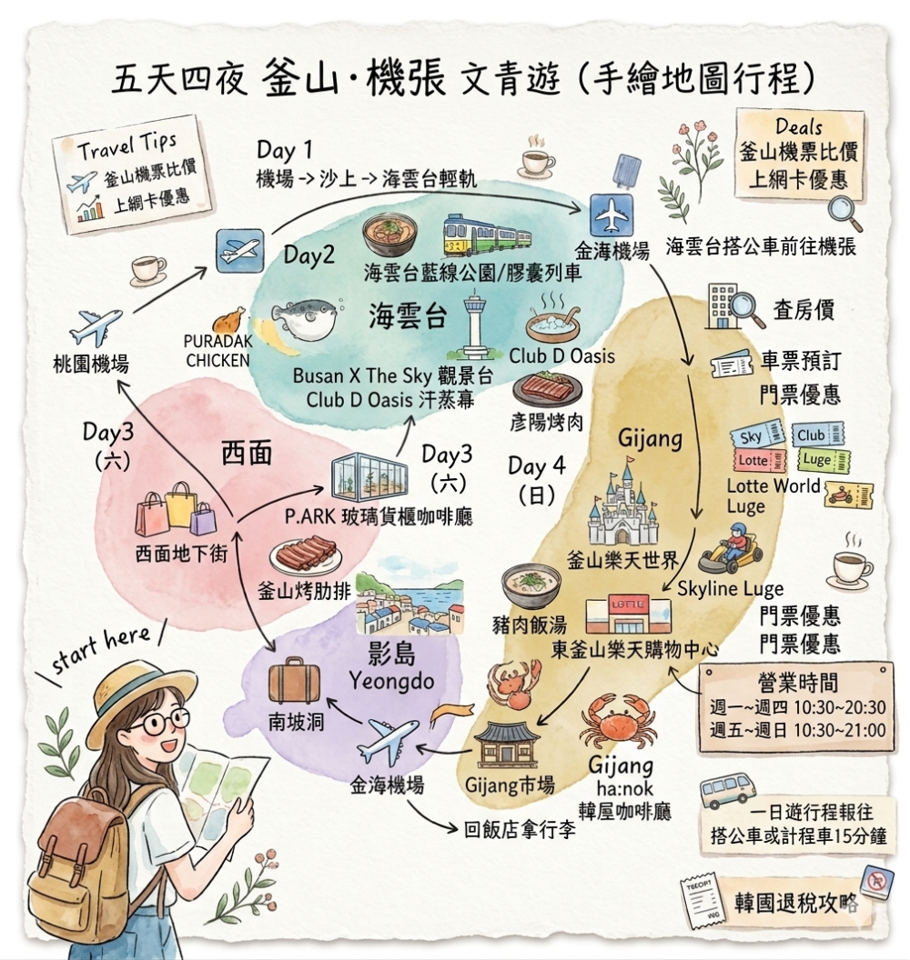 景點與食物: 針對行程中提及的特色景點(如釜山景點甘川文化村、機張郡的樂天冒險遊樂園區、影島的白淺灘文化村、海雲台膠囊小火車)或餐飲(如豬肉湯飯、小麥冷麵、韓國烤肉),繪製對應的精緻插圖,並附上地點名稱標籤。