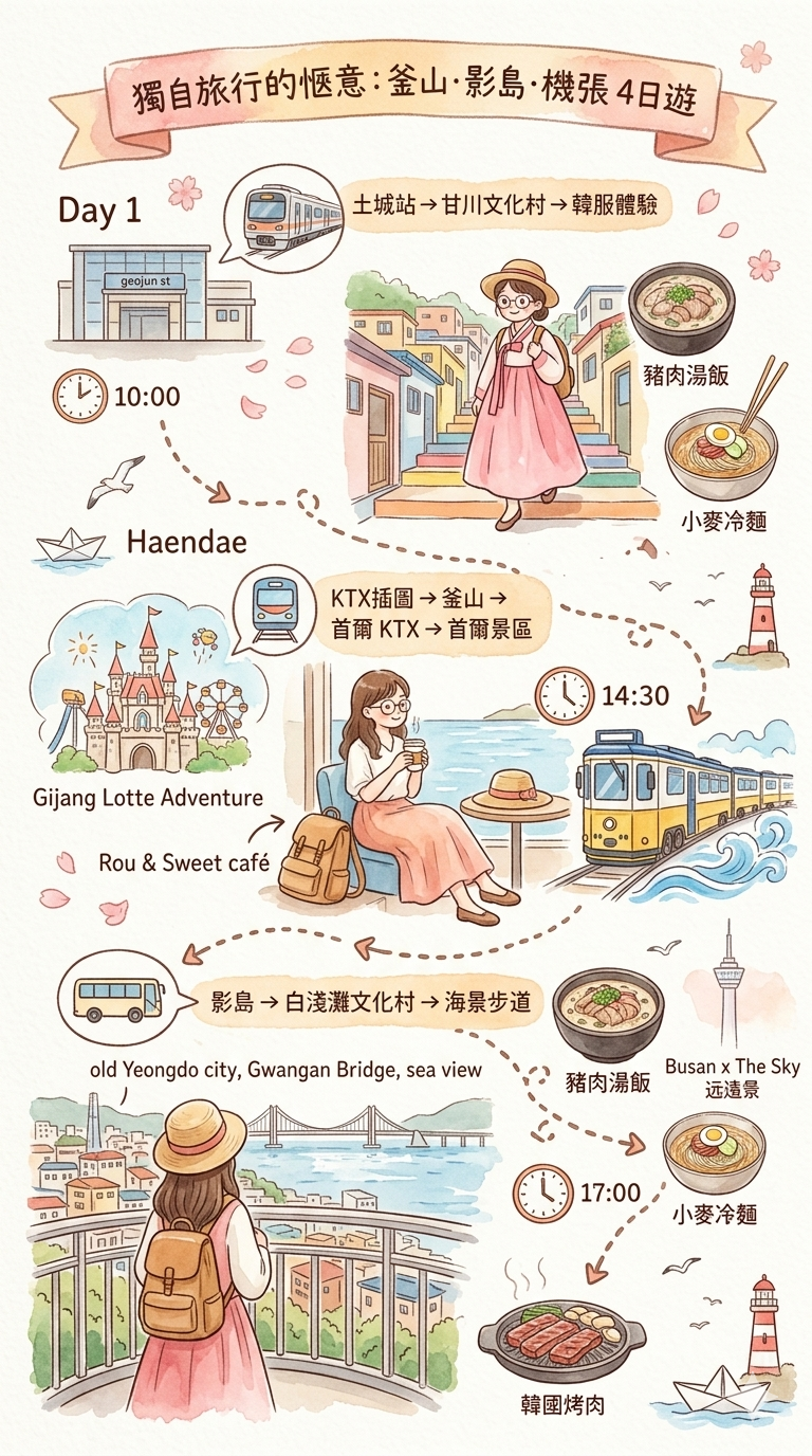 主要任務: 將提供的純文字行程表,轉譯成一幅充滿日本文青氣息、手繪水彩質感的故事地圖。請務必將參考圖中的角色形象融入畫中,描繪她獨自旅行的姿態(例如:穿著韓服在甘川文化村、在特色咖啡廳小憩、或是在展望台眺望的背影)。