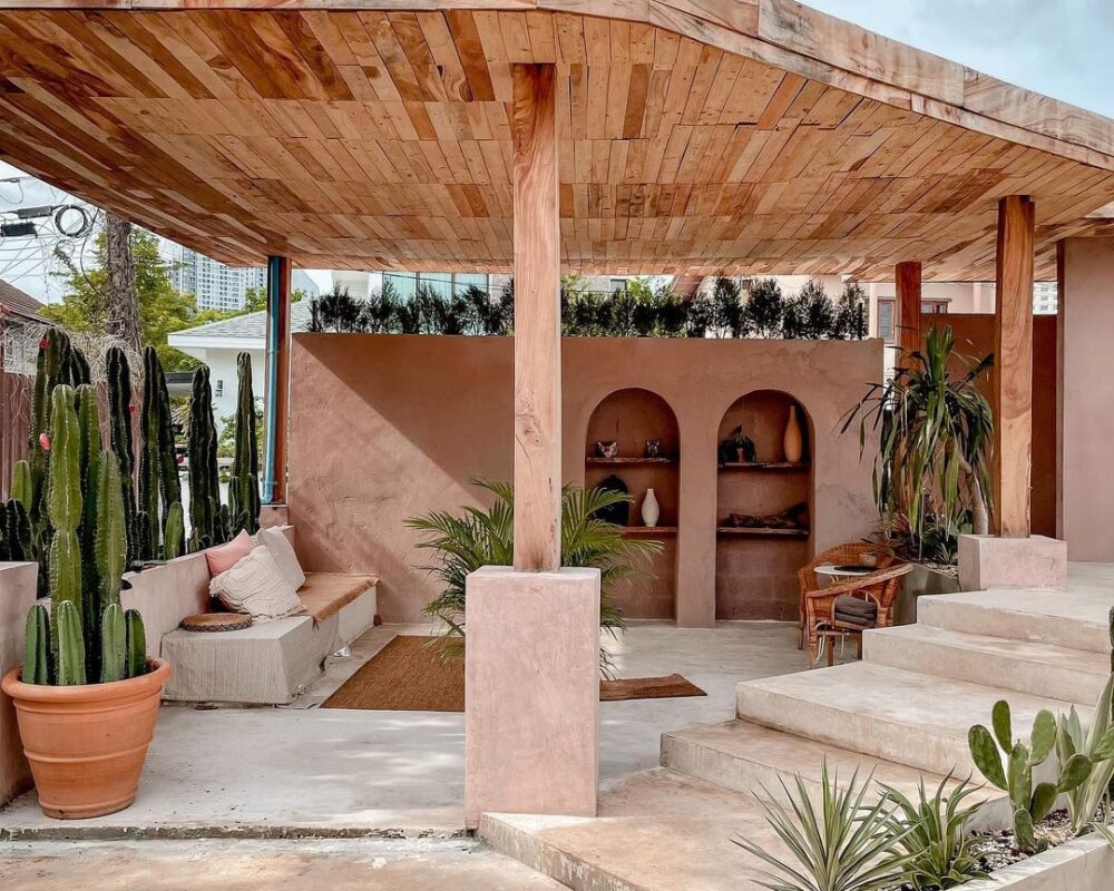 想一秒飛到北非?不用搭長途飛機,在曼谷近郊就能走進這間以摩洛哥沙漠洞穴為靈感的異國風Cafe!全店以米色與陶土色為主調,牆壁和天花板打造成不規則的弧形線條,搭配木質傢俱與仙人掌,每個角落都充滿濃濃的北非風情。無論是 拱門、窗邊座位 還是 戶外區,都超好拍,隨便一站就是明信片等級的美景!白天是悠閒咖啡館,提供地中海風味輕食與早午餐;晚上則變身氣氛餐酒館,搭配多款特色Mocktail與冰沙,咖啡控或無酒精飲料愛好者都能找到心頭好。