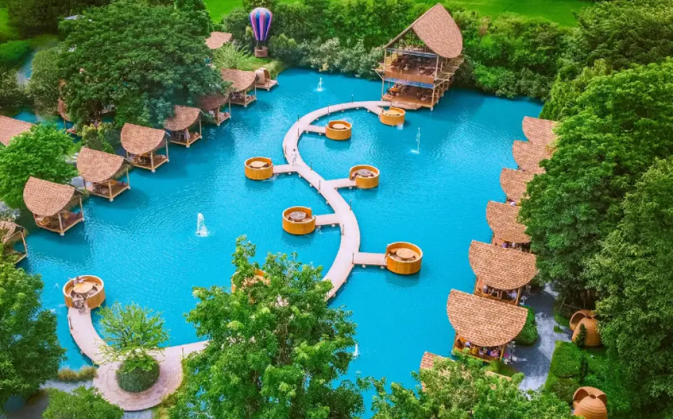 風格: 海島度假漂浮風。建於藍色湖景之上,擁有木質棧道與獨立船型草屋,充滿熱帶島嶼氣息。