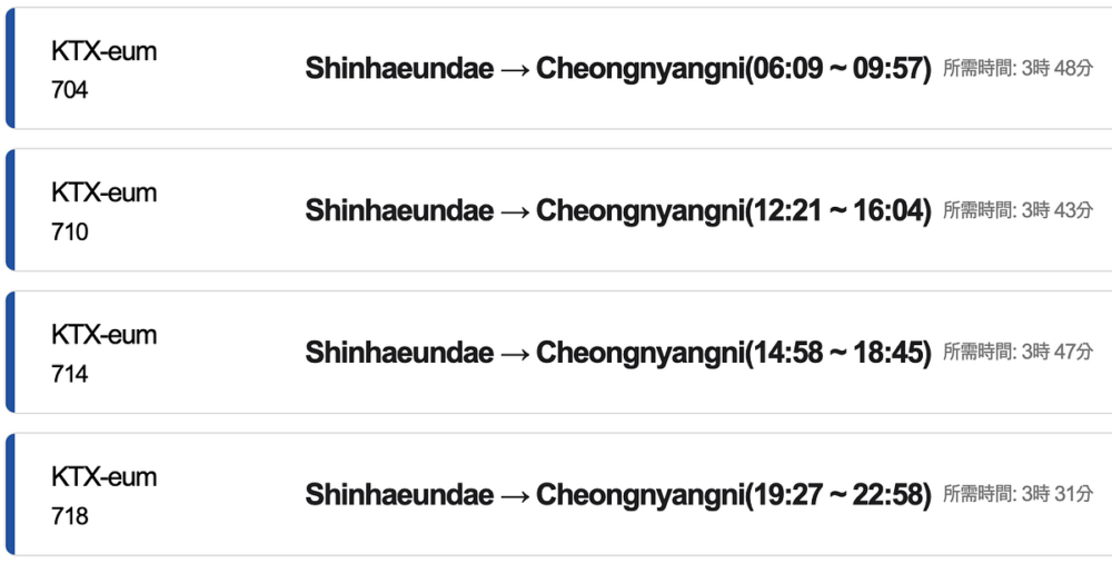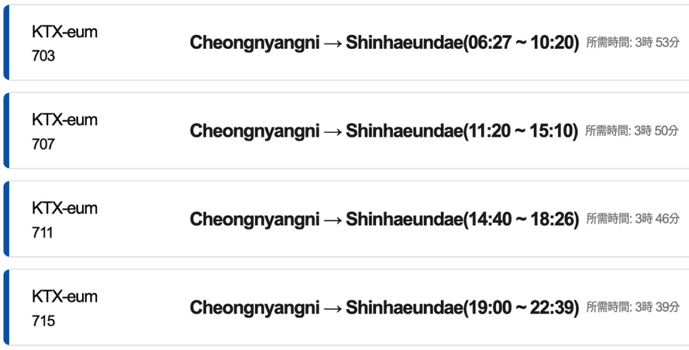 首爾清涼里站→釜山新海雲台站